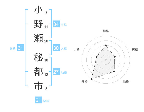 小野瀬 秘都市さんの総格は61画の3点!