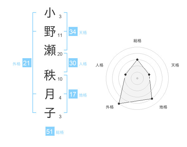 小野瀬 秩月子さんの外格は21画の5点!
