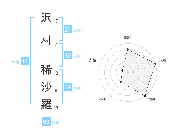 沢村 稀沙羅さんの総格は63画の4点!