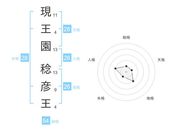 現王園 稔彦王さんを姓名の画数から五運を鑑定