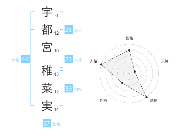 宇都宮 稚菜実さんの地格は39画の5点!