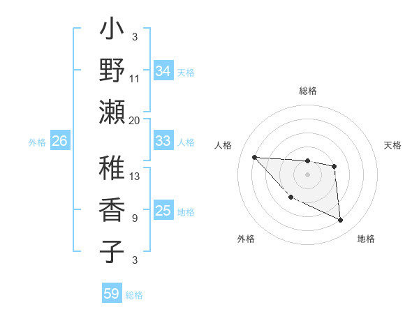 小野瀬 稚香子さんを姓名の画数から五運を鑑定