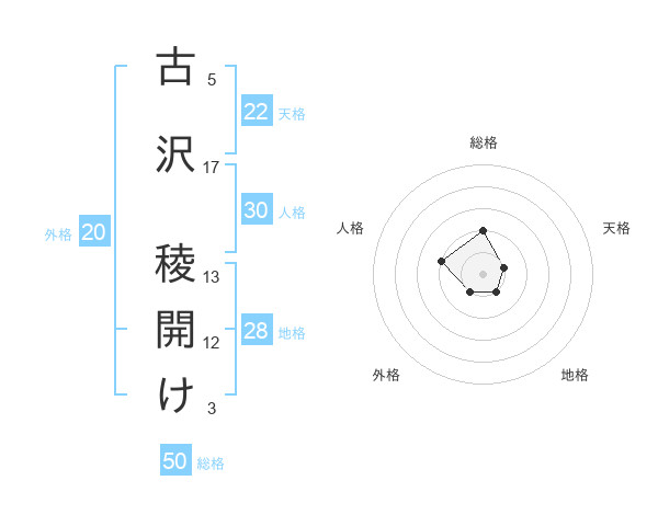 古沢 稜開けさんの総格は50画の2点!