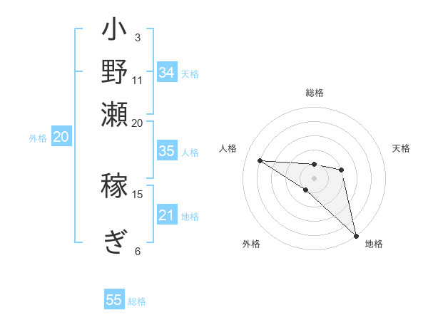 小野瀬 稼ぎさんを姓名の画数から五運を鑑定
