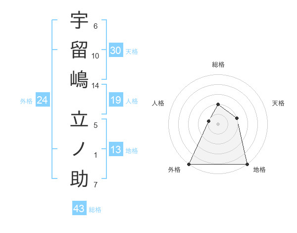 宇留嶋 立ノ助さんの総格は43画の2点!