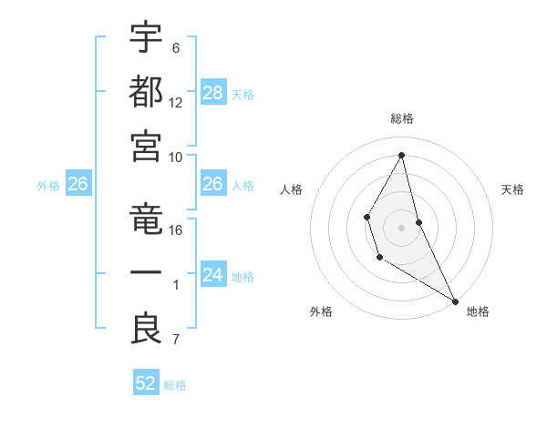 宇都宮 竜一良さんを姓名の画数から五運を鑑定