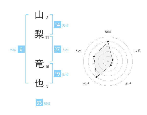 山梨 竜也さんの総格は33画の4点!