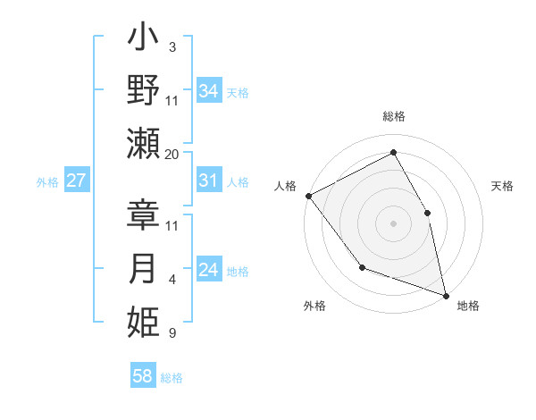 小野瀬 章月姫さんを姓名の画数から五運を鑑定