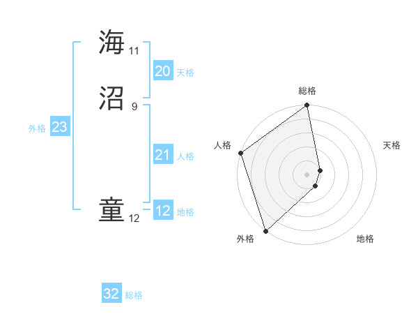 海沼 童さんの総格は32画の5点!