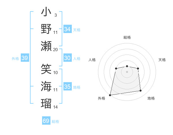 小野瀬 笑海瑠さんの外格は39画の5点!