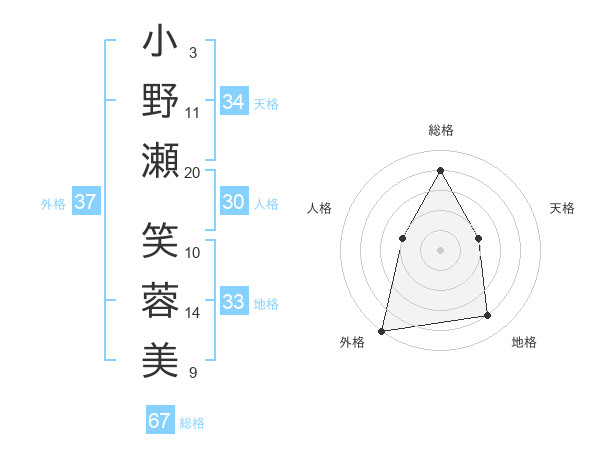 小野瀬 笑蓉美さんの総格は67画の4点!