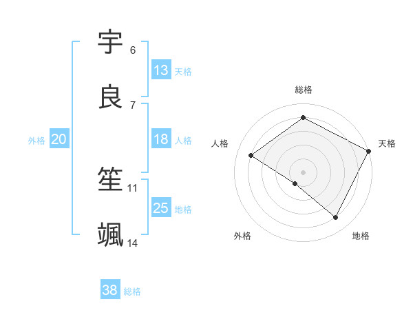 宇良 笙颯さんの総格は38画の4点!