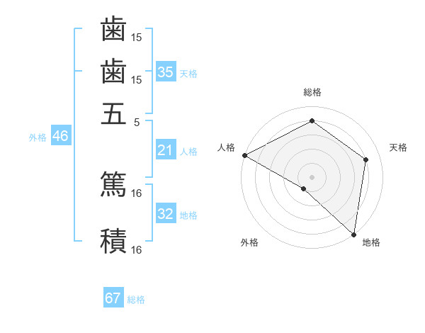 歯歯五 篤積さんの総格は67画の4点!