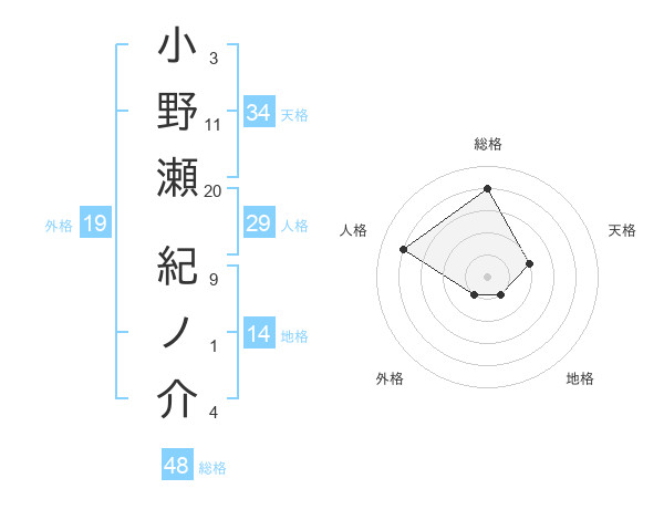 小野瀬 紀ノ介さんの総格は48画の4点!