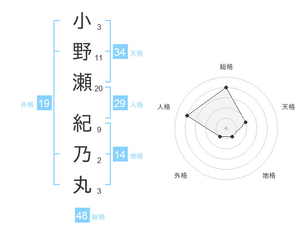 小野瀬 紀乃丸さんの総格は48画の4点!