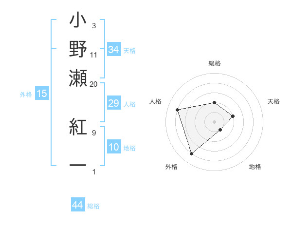 小野瀬 紅一さんの総格は44画の2点!