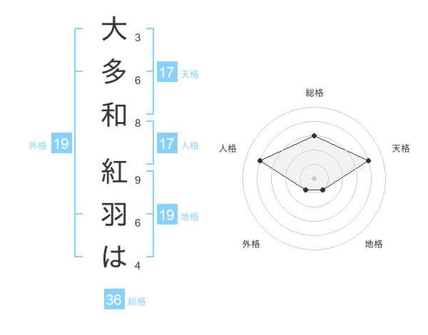 大多和 紅羽はさんの総格は36画の3点!