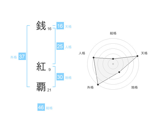 銭 紅覇さんの外格は37画の5点!