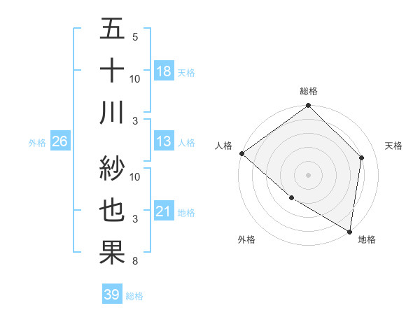 五十川 紗也果さんの総格は39画の5点