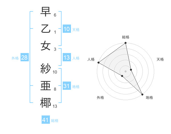 早乙女 紗亜椰さんの総格は41画の5点!