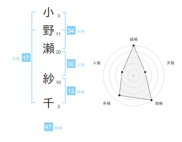 小野瀬 紗千さんの総格は47画の5点!