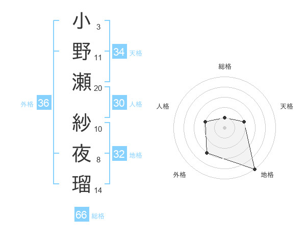 小野瀬 紗夜瑠さんの総格は66画の1点