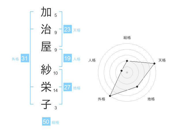 加治屋 紗栄子さんの天格は23画の5点!