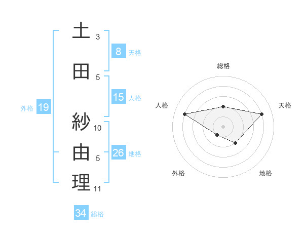 土田 紗由理さんの総格は34画の2点
