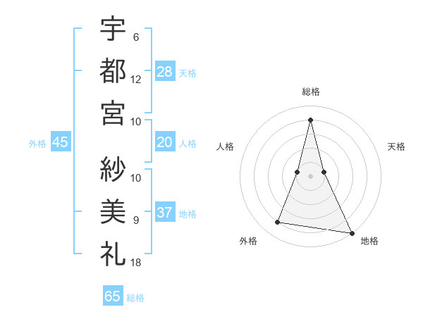 宇都宮 紗美礼さんの総格は65画の4点!