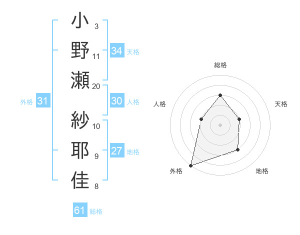 小野瀬 紗耶佳さんの総格は61画の3点!