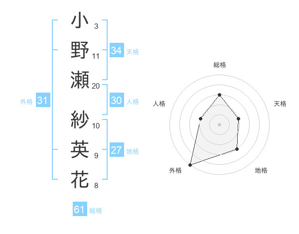 小野瀬 紗英花さんを姓名の画数から五運を鑑定