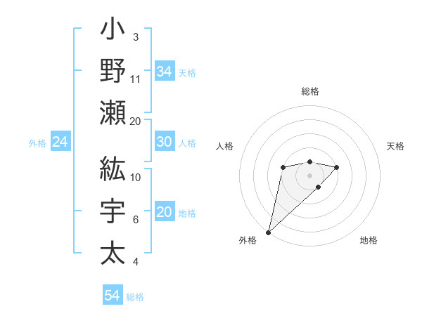 小野瀬 紘宇太さんの総格は54画の1点!