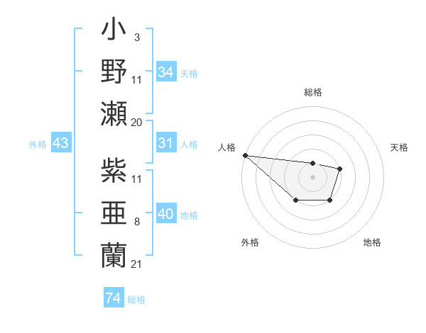 小野瀬 紫亜蘭さんの総格は74画の1点!