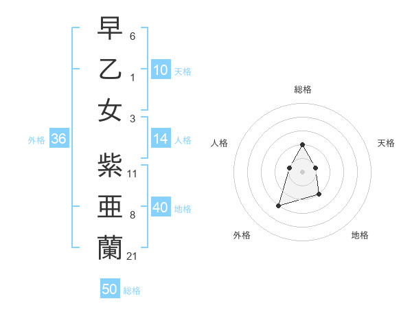 早乙女 紫亜蘭さんの総格は50画の2点