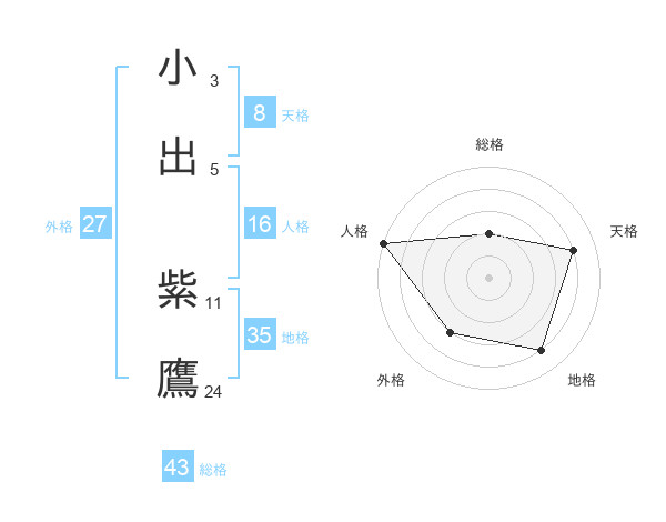 小出 紫鷹さんを姓名の画数から五運を鑑定