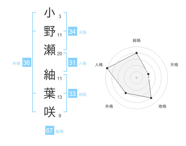 小野瀬 紬葉咲さんの総格は67画の4点!