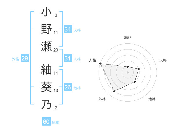 小野瀬 紬葵乃さんの総格は60画の1点!