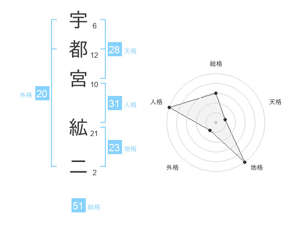 宇都宮 絋二さんの総格は51画の3点!