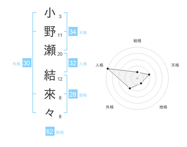 小野瀬 結來々さんを姓名の画数から五運を鑑定