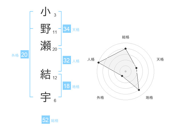 小野瀬 結宇さんの総格は52画の4点!