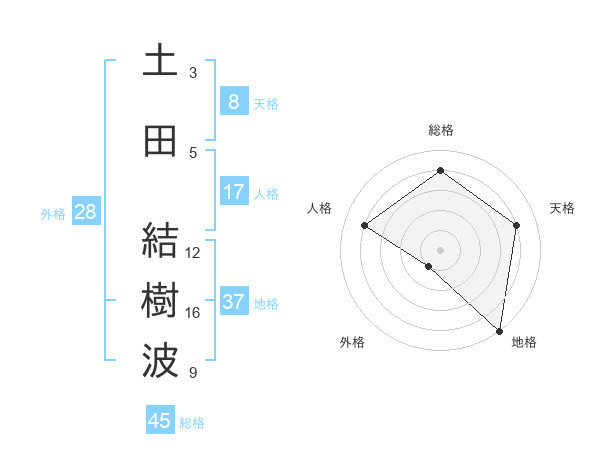 土田 結樹波さんを姓名の画数から五運を鑑定