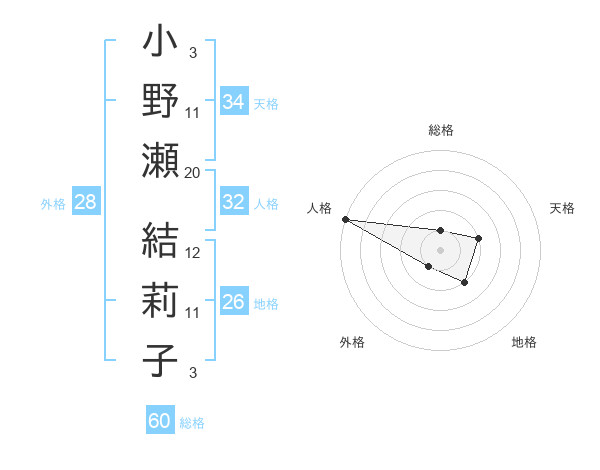 小野瀬 結莉子さんの総格は60画の1点!