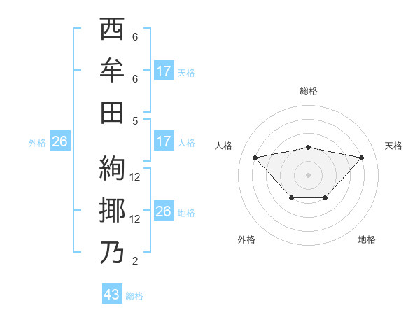 西牟田 絢揶乃さんの天格は17画の4点!
