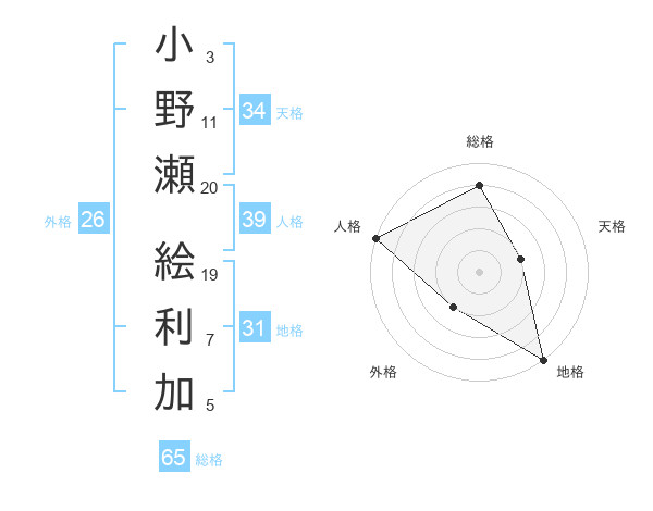 小野瀬 絵利加さんの総格は65画の4点!