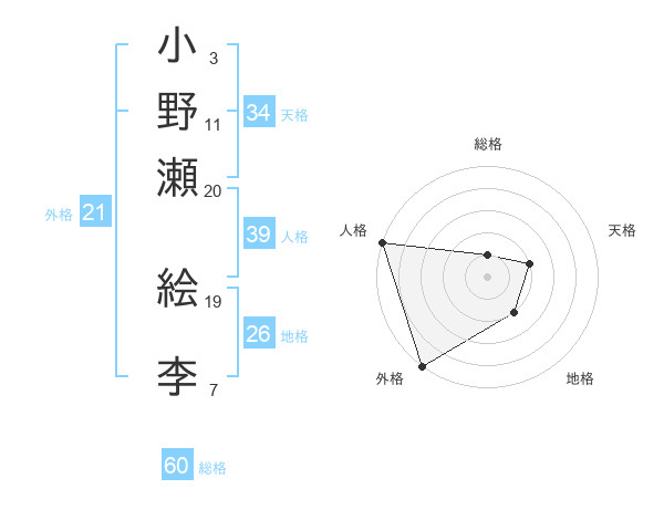 小野瀬 絵李さんの総格は60画の1点!