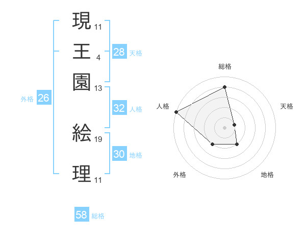 現王園 絵理さんの総格は58画の4点!