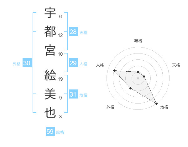 宇都宮 絵美也さんの総格は59画の1点!