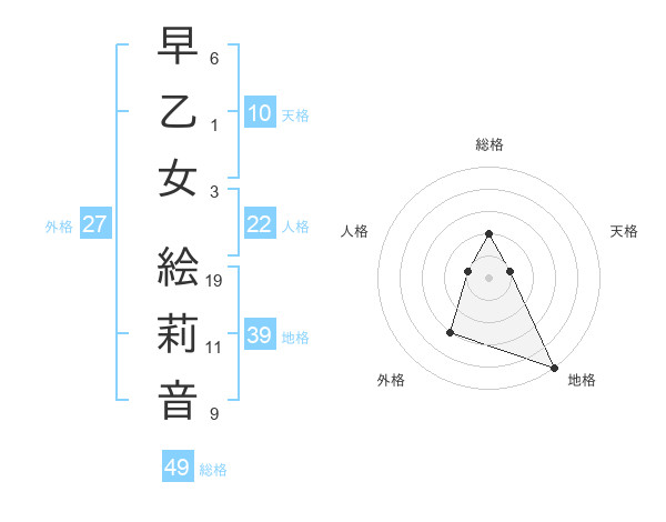 早乙女 絵莉音さんの総格は49画の2点!