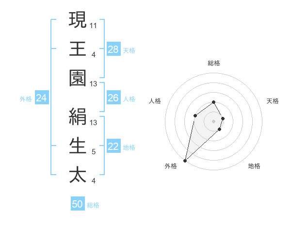 現王園 絹生太さんを姓名の画数から五運を鑑定