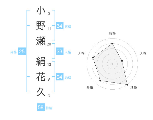 小野瀬 絹花久さんを姓名の画数から五運を鑑定